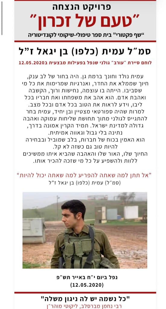 הנצחה פעילה ומשמעותית למשפחות השכולות: כאשר חיילים בשיקום מכינים את המתכונים של הנופלים, המשפחות זוכות להנצחה פעילה ומוחשית של יקיריהן.