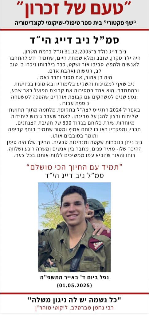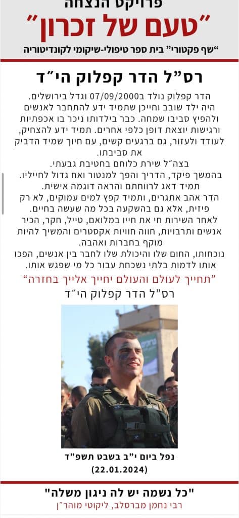 הפעילות יוצרת חיבור ערכי ואמוציונלי לזיכרון החלל, מחזקת את תחושת הערך והמשמעות של חייו, ומאפשרת חווית הנצחה מכבדת ובריאה דרך עשייה מוחשית.