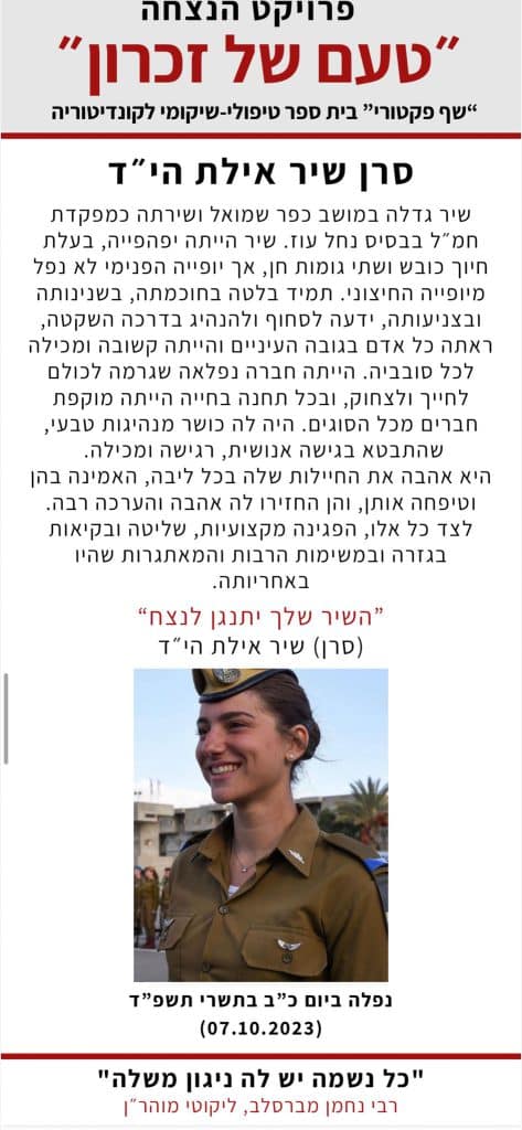 העבודה המדויקת בקונדיטוריה מספקת חוויה חושית מתקנת, בעוד ההנצחה יוצרת חיבור ערכי ומשמעותי לזיכרון חללים, שמאפשרת עיבוד בלתי מילולי של טראומה וחיזוק חוסן נפשי, ללא הצפה של האבל או הזיכרון הכואב.